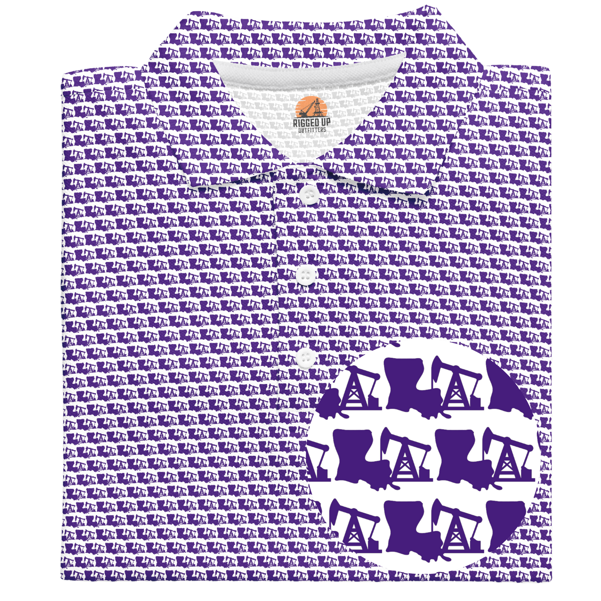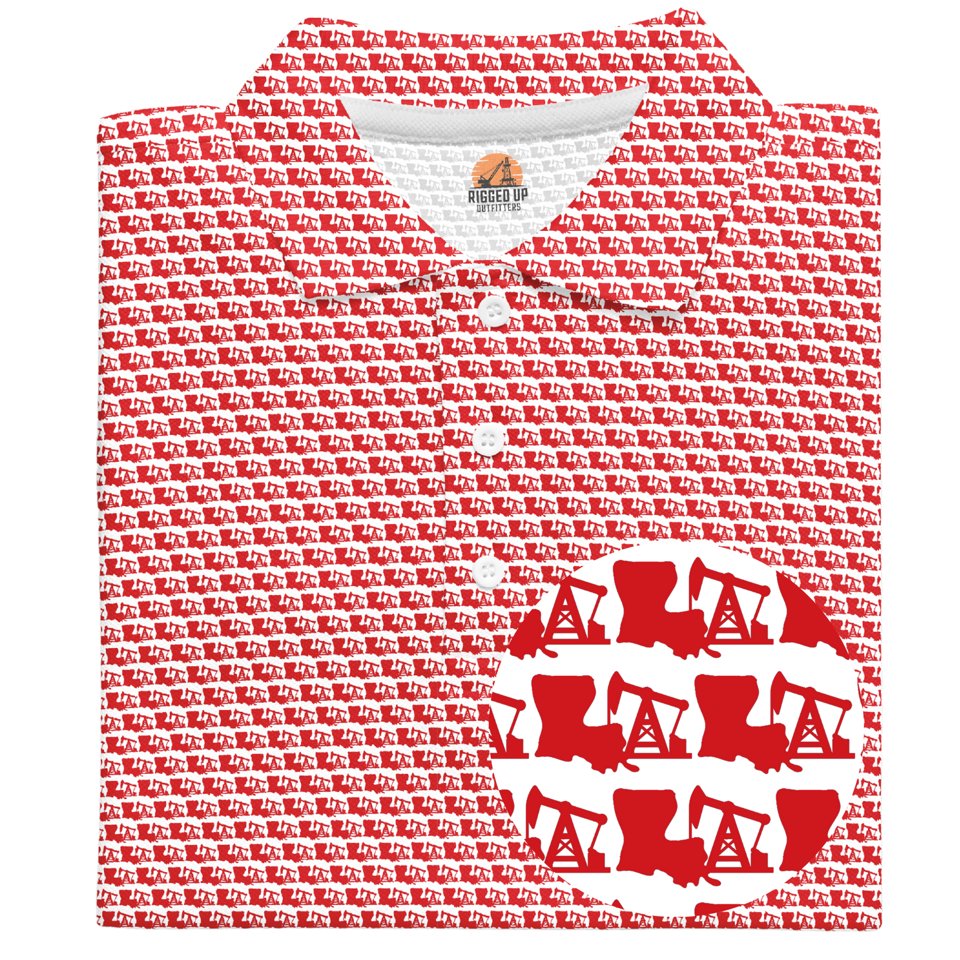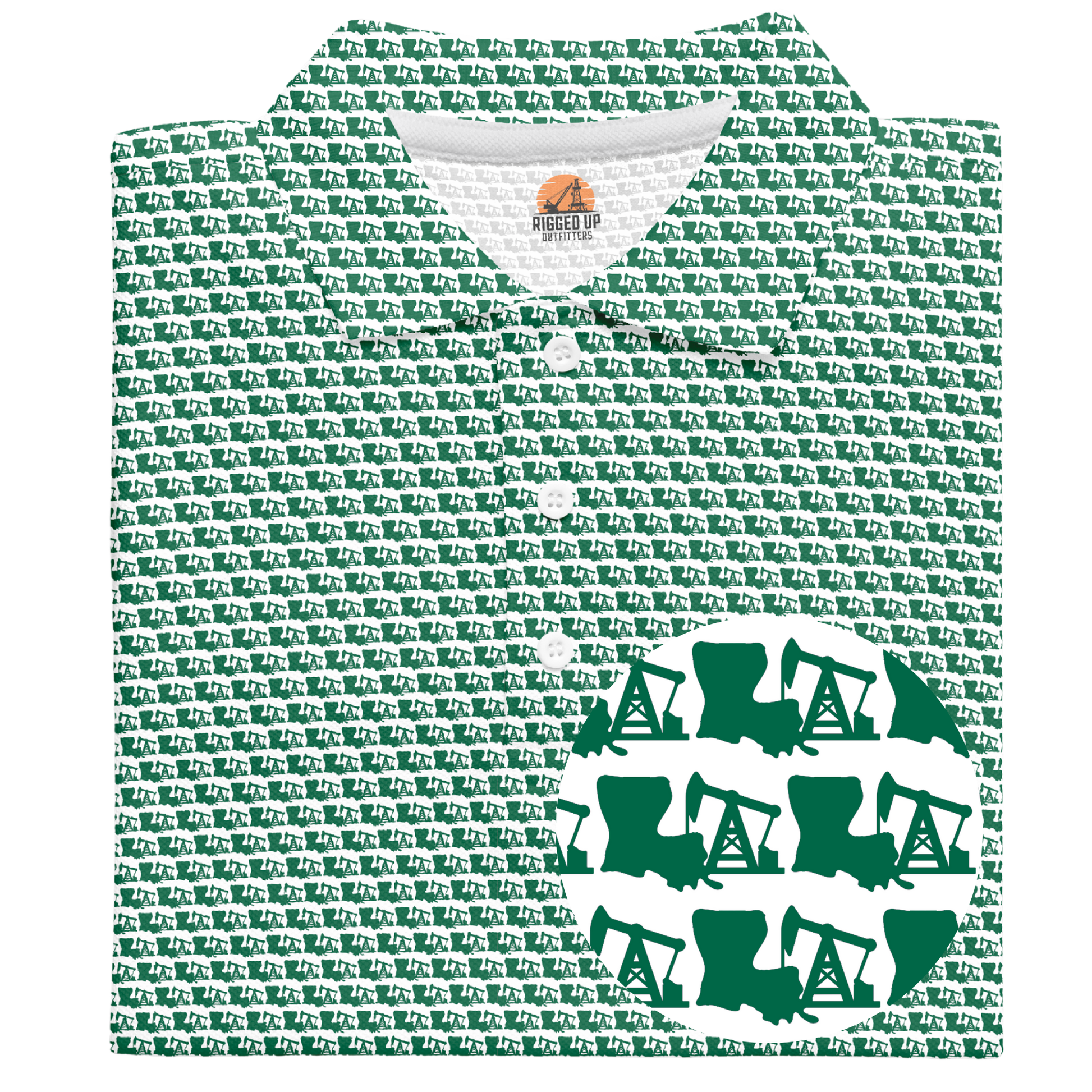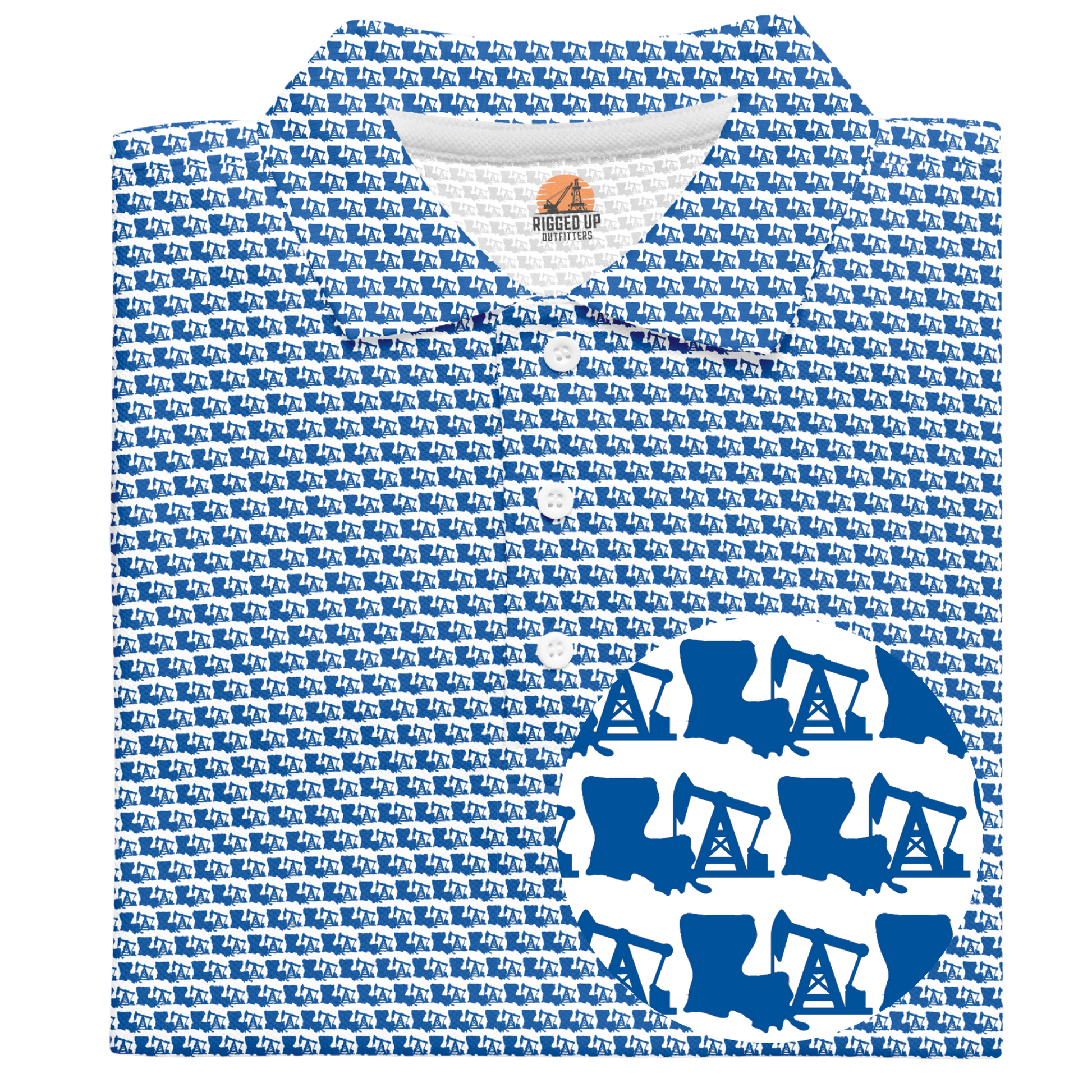 Step onto the green like you just stepped out of a rig-side crawfish boil. The Crude Cajun polo is a wild fusion of Southern swagger and oilfield grit, featuring a bold all-over print of Louisiana’s unmistakable boot and the iconic pump jack—because why choose between state pride and industry hustle when you can wear both?
